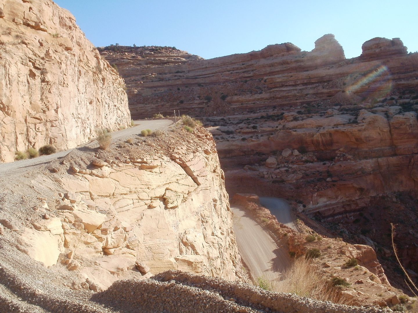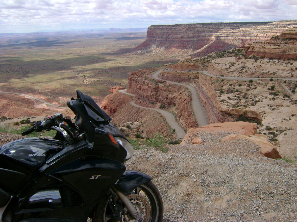 Just southwest of Mexican Hat. The "Forrest Gump Point".  Just north of Mexican Hat Utah, Goosenecks State park. A great place to pitch a tent for the night. You can camp right next to the gorge edge just be sure the wind doesn't blow you over at night.  Just northeast of Mexican Hat, the Moki Dugway pass up the escarpment. Utah is a great place to ride for the roads and the views.  I wish I would have stopped for the Forrest Gump pic. Next time