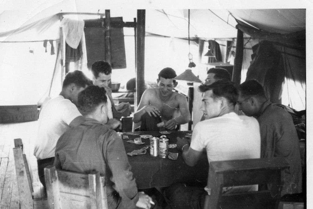 A slow day in my outfit, the 618th Medical Clearing company.  This is the entire motor pool personnel except for me. The money that you see is MPS (military payment script).  Note that all haircuts were short unlike the tV series MASH which was wrong in that respect.