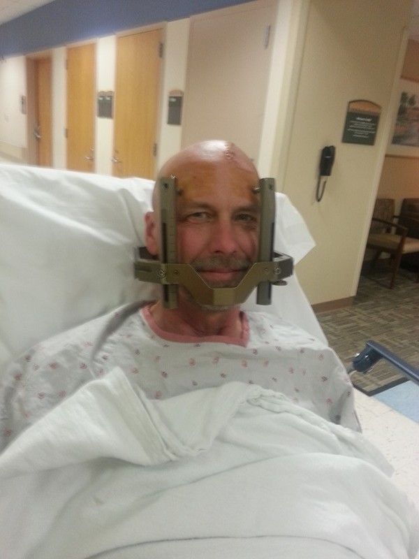 From Dave this morning ........ Dent. Yep....just what I felt like when they strapped this thing to my skull. I'm pretty non-squeamish but this thing REALLY creeped me out. In fact, I had to take full meds that basically knocked me out for a few hours that day. I know it was all for the common good but......yuck. When they were wrenching that thing into the 4 points of my skull....uggggg. I don't complain much about what I have had to deal with...just doesn't pay but this is my "that one time" at the University. Thankfully, that one is behind me. Besides, I already have enough holes in my head Thank you again for all your support...love, caring, and keeping the head above water. Love you all