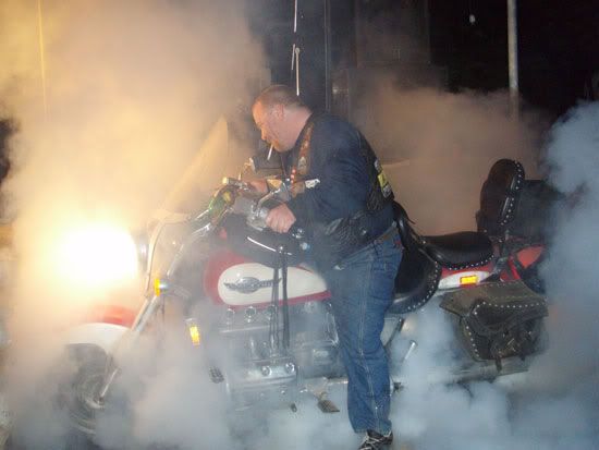 Reminds me of Charlie The Sculptor a number of years ago during Bike Week. We pulled up to a light and were suddenly surrounded by a bunch of crotch rockets, half who immediately started to do burnouts while waiting for the green. Charlie got this twinkle in his eye, saw him kick it into gear and proceeded to light it up. With his Viking pipes barking and the sound of the rubber screeching, it was too much for the little fellers. You should have seen the smoke, all the CR's around us just stopped burning and looked straight ahead. Charlie just laughed as we pulled away. Aaah....the good old days.