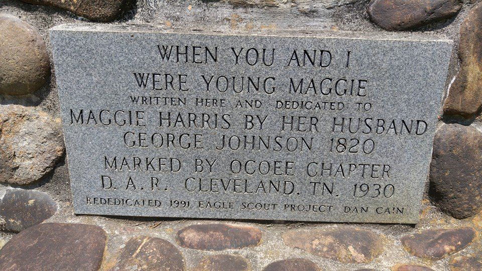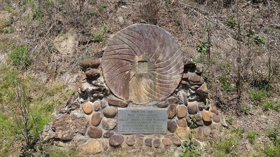 The story begins as we meander along the route of the millenium-old Unicoi Turnpike in the hills of Tennessee, just north of the spot where John Muir crossed the Hiwassee River on his thousand mile walk to the Gulf of Mexico (September 17, 1867). As soon as I saw the sign for Maggie’s Mill Historic Site, I pulled onto the gravel road leading to a small stream. Some pilings along the creek told me that a mill, long since gone, had operated there. And then, at the edge of the road, I read this marker: