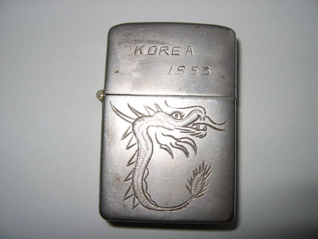 lighter with an engraving of a dragon and the words Korea 1953 on it" She reached under the desk and