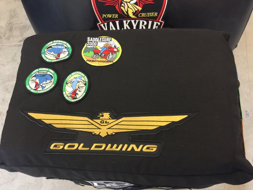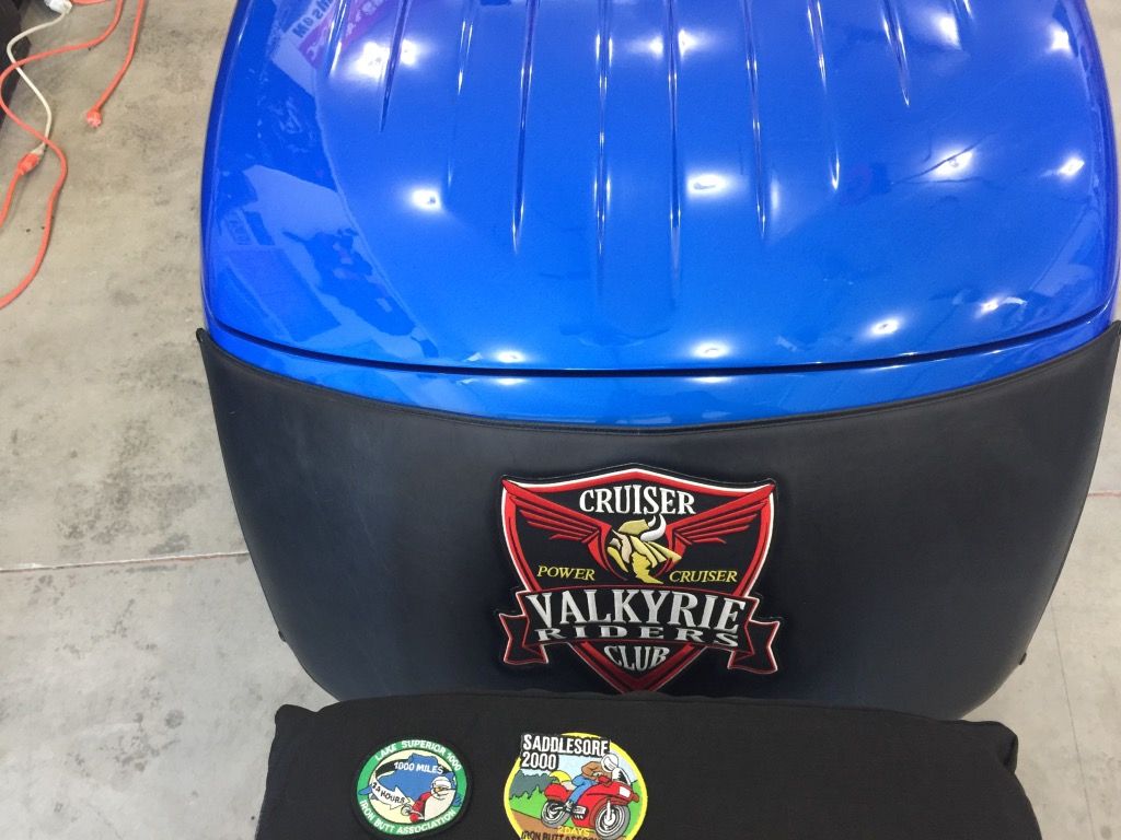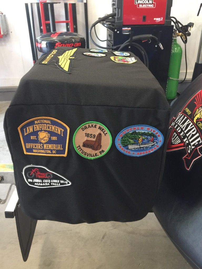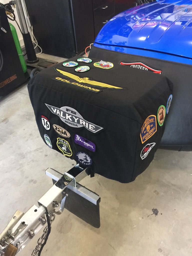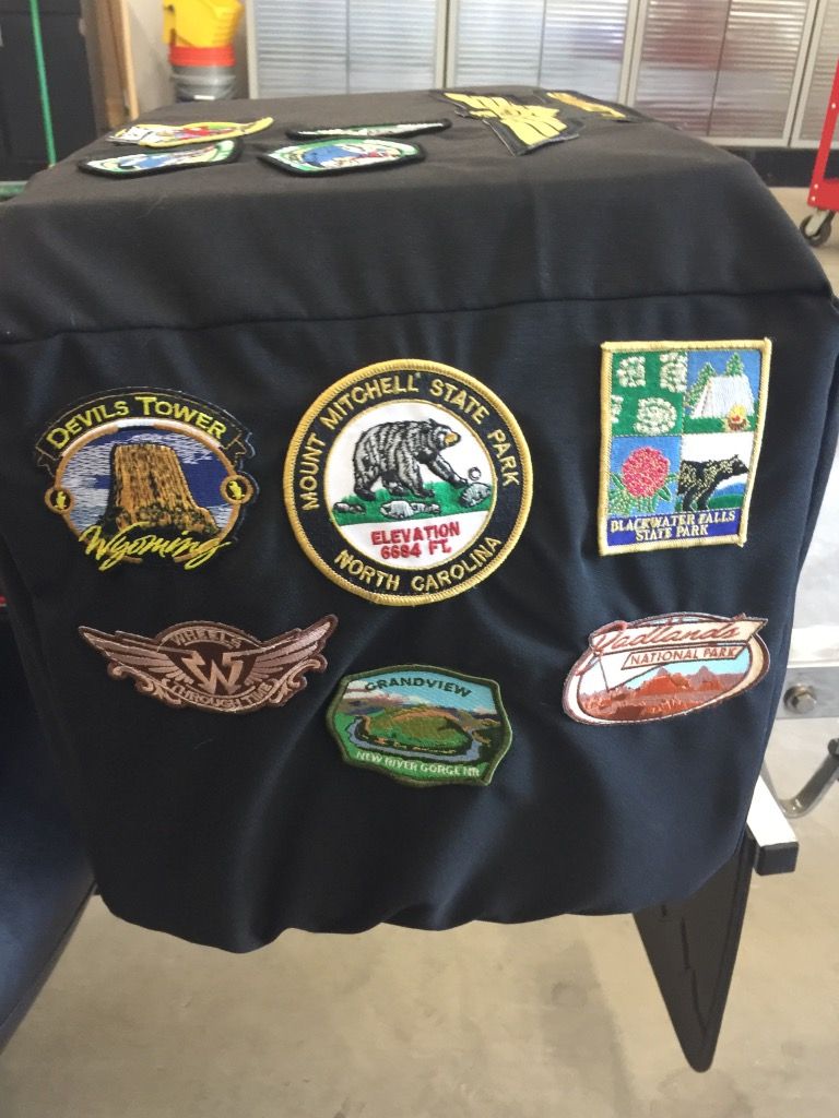 Great to have a wife who knows how to sew (most don't have that skill anymore). She made my "vision" come true. Sewed a canvas cover for the cooler on our trailer. All the patches for our various rides were then added. Looks awesome! Thanks JoJo!
