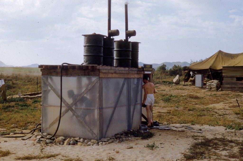 Due to an ingenious motor sergeant and willing help, we manged to get hot showers in the company instead of riding in a truck 2 miles down dusty roads. A rejuvenated gasoline powered water pump and immersion heaters did the job.