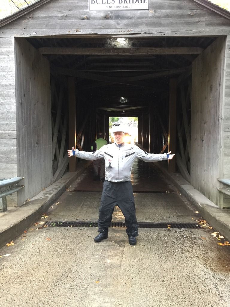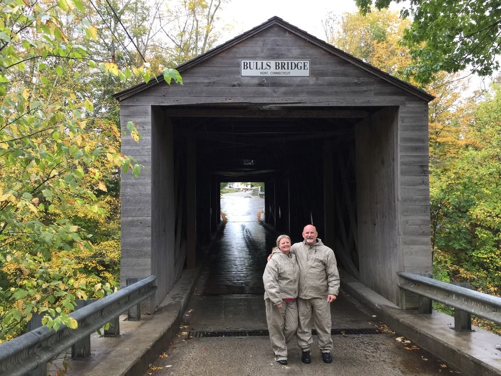 Our first covered bridge. As you can tell from our beautiful attire it was a little wet. Everybody was a good sport for taking us there. Bob and Dan didn`t even have Raingear on.