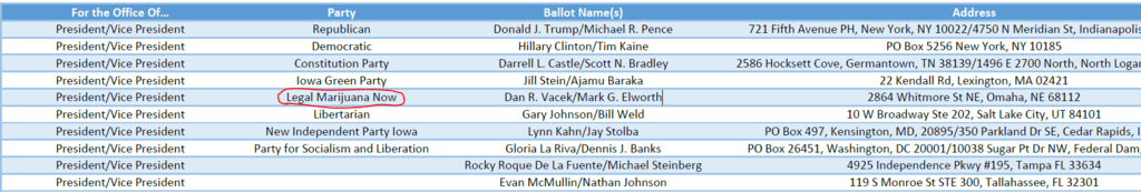 Well, I was signing up for my Iowa absentee ballot as I didn't get registered in TN soon enough before the deadline. I noticed a new party on the candidate listing for President/Vice President.  I'm not familiar with the "Legal Marijuana Now" party.