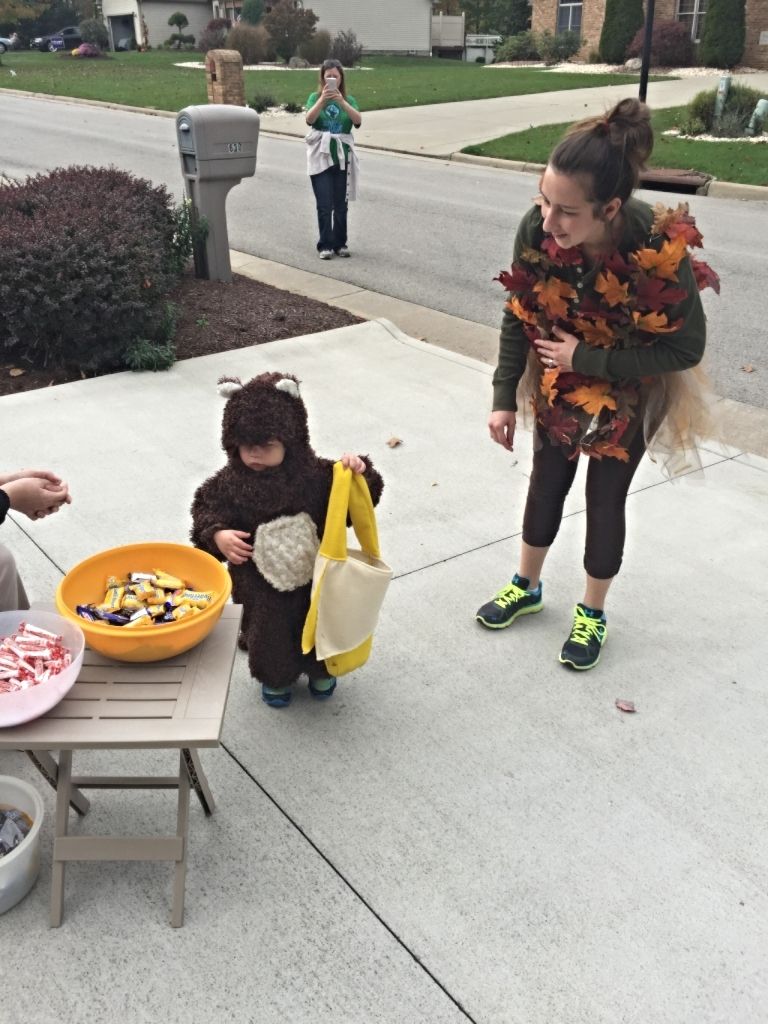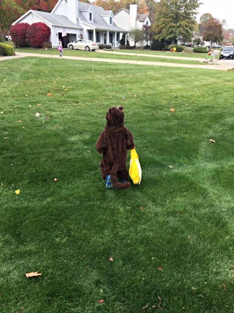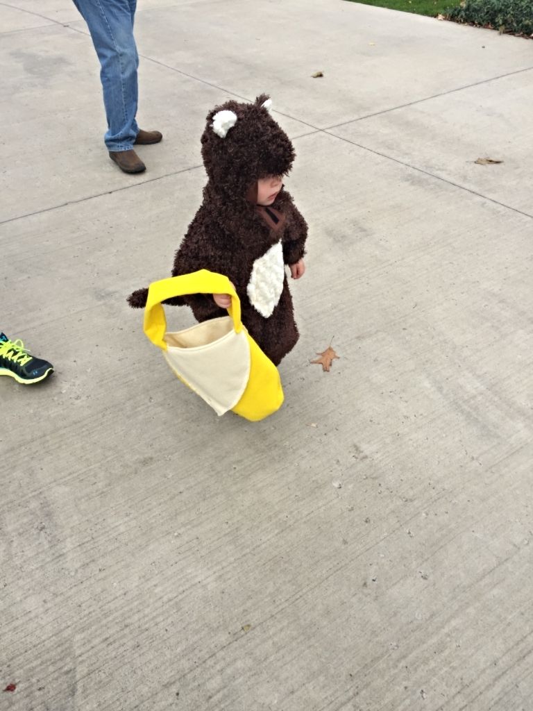 Cute child. Good time for grandparents and grandchild as well. I seem to remember a costume about like that in my family a few years ago. It's a cute costume and well made. ... and after he got his candy made sure to say "tan to" (thank you). The little girl next door is four. Her mother tried to teach her to say, "Thank you." Since her mother was telling her to say, "Thank you" something got messed up in the person of the pronoun. She says consistently, "Thank me." It's so cute we haven't bothered to correct her.