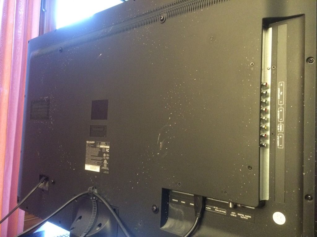 Well, all flat screen TVs - computer monitors pick up dust (or whatever's floating around in the house) from the electronics/magnetism and the heat can make it sticky. Dandruff?
