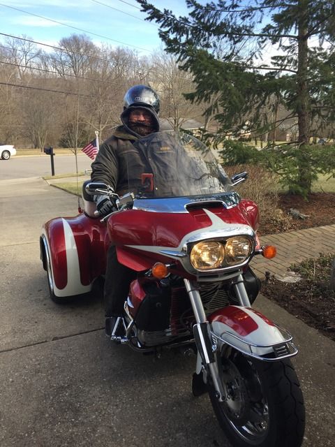nice bike, looks sharp, one of a kind. never thought I would say this, but with the attire on all bundled up, that large Valkyrie trike looks almost too small for you? For sure the best trike I have seen by far. enjoy the ride, for me will wait until end of March, although heard rumors in another week or so might hit 49 degrees which is unheard of in February this time of year...  Thanks Cookie. Never thought about it, but 4 layers on top of a 375 pound frame does look kind of large. Got to get slimmer clothes I guess.