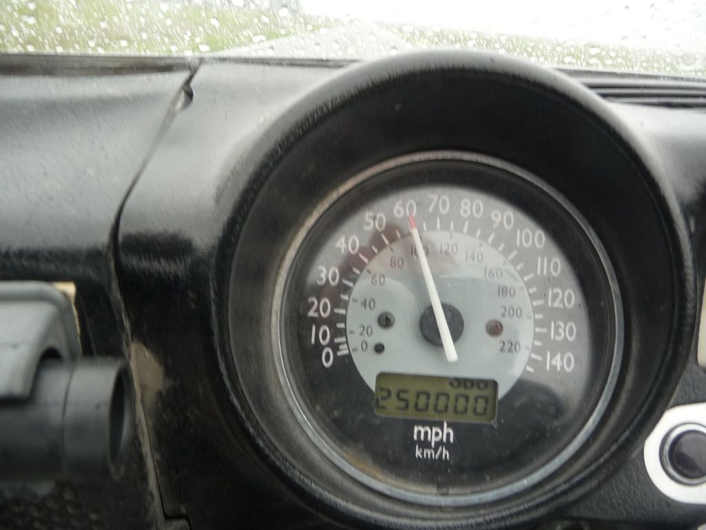 million miles that is ......a rainy day, frog toggs on, Peet's coffee run and the old lady is perking along just great.......time for an oil change.....