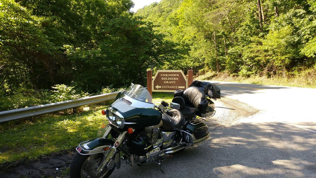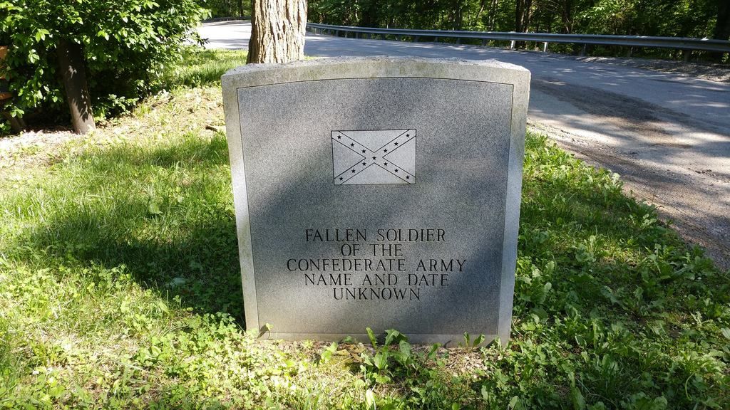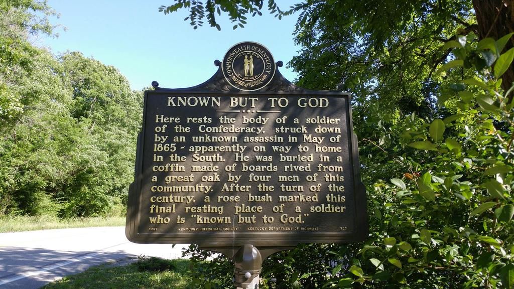 ( Updated Thanks to JimmyT wife Patti ) On KY Rt. 80, near Elkhorn City, in the Breaks Interstate Park, a historical highway sign marks the gravesite of an unknown Confederate soldier who is "Known But To God." In May of 1865, the soldier, who was on his way home after the close of the Civil War, was struck down by unknown assailants and killed. Four men of the community, namely Henry and George Potter, Zeke Counts and Lazarus Hunt, fashioned a coffin for the soldier, made of boards rived from a great oak in which he was buried at the spot where he had died. The Potter family kept the soldier's cap and watch in hopes to be able to give them to family members in search of their loved one. Sadly, nobody ever came to look for him. Years after, the keepsakes were lost in a fire. In 1900, a rose bush was planted at the gravesite by Harve Potter and in more recent years a historical highway marker was placed in order to keep the memory of this unknown soldier alive.