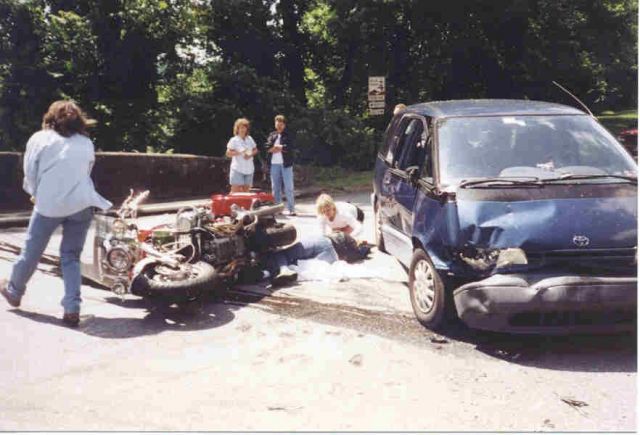 Yep, left turners will get you....one got me back in '03 totaled both vehicles. Cop said that he had never seen as much damage to a car without it being a fatality. I had a hairline fracture on my left heal and left thumb and my passenger aggravated a previous back injury... Dont remember if the helmet was damaged or not. As a former MSF instructor I used to advise that folks should wear a helemt...not anymore because I dont really care, it is their decision and they have accpted the consequences for not wearing one...my most recent accident wththe hit and run left some small grooves in my helmet