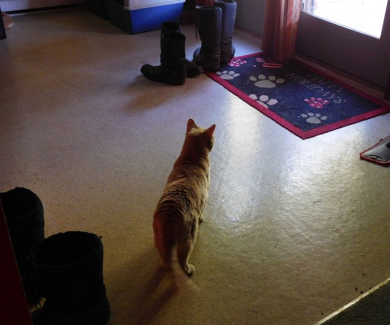 The other day in the late afternoon.. This happened 7/10  The top 2 were taken from the kitchen sink window. Anyone who has been here at the farm knows this . Around 8 pm ..  Then he turned back around, Then he headed to the kitchen entrance. He looks to be about a 2+ year old boar bear in the size range of 250 -350 lbs ..  I think this is the one that walked through the garden about a month ago! He then when to the front of the porch. This was taken from the big living room window. Yuppers you can see the garden .  The great ScooterCat , warned us about the bear in the first place.. We where watching a movie " Lighting Jack " And scoot trotted across the room growling ! Heading for the bedroom ! I thought it was just a tom cat that spooked her . Boy howdy was I ever wrong.. I grabbed the camera, as I said to HB A BEAR ! Here right outside the door! Then I started snapping pic... With out giving myself away at the windows and glass door.  Don finally went outside and shot by the bear.. Just to let him know he was NOT welcome . The bear then skedaddle in to the woods fast ! He didn't have any button ear tags, so he is a native to the mountain.  Scootercat is still looking for the bear .. You can see by her body language she is upset and alert , BTW she did go under the bed to hide for a while. I took this after she came out.  Ya got to love living on a mountain top.