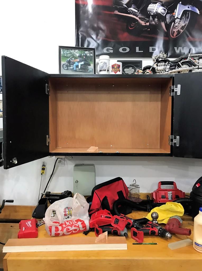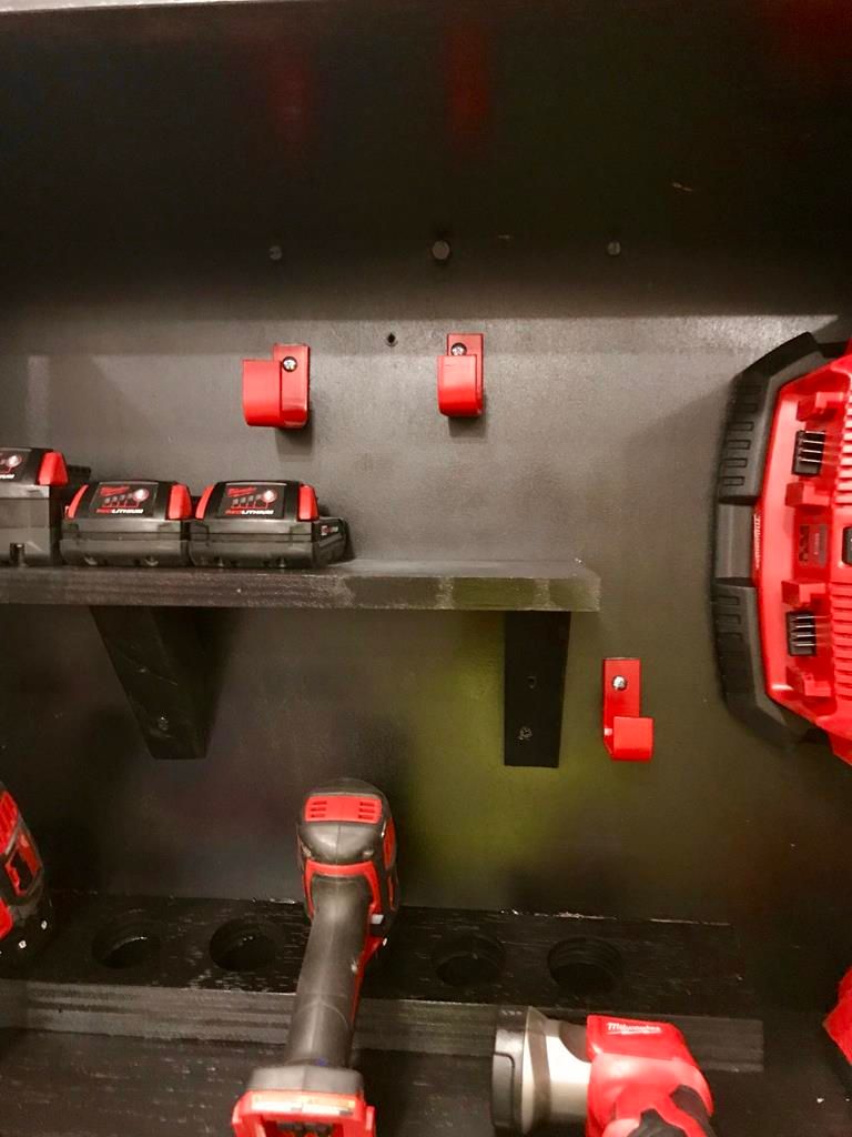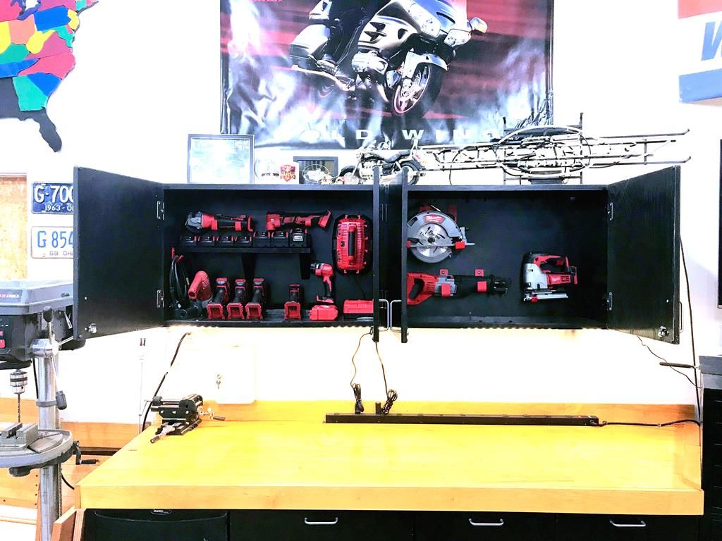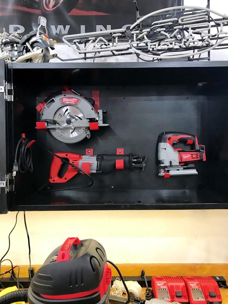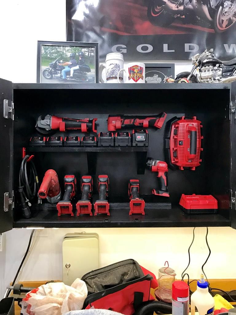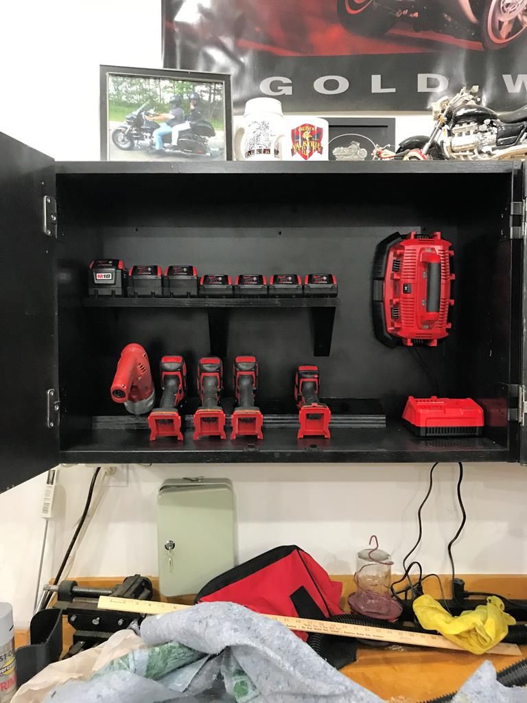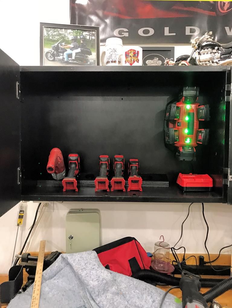Didn't want to just throw them in drawer. Many nice examples of hanging under the cabinet, but mostly just drills and drivers... I need to store other stuff as well. Also thought about pegboard (metal), but the hangers you can get are flimsy and not adaptable to specific cordless tools. Also what to do about chargers & batteries.