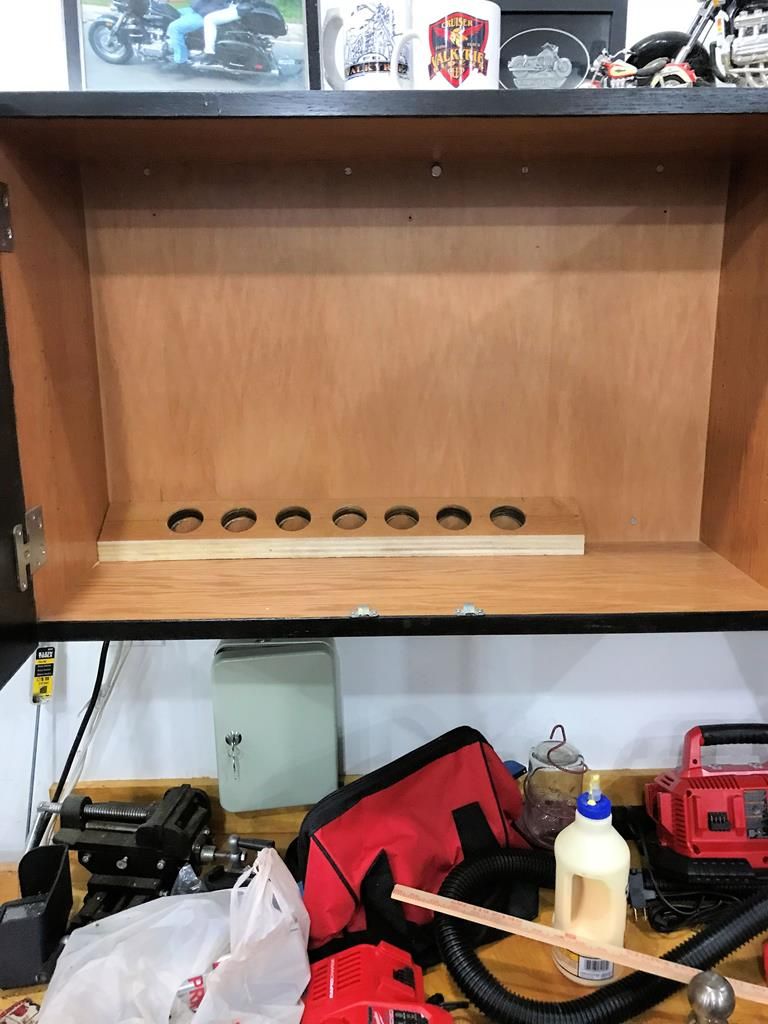 Cut up the removed shelf. Cut one side at an angle to meet the back of the cabinet and the other to be 90 degrees to the bottom of the cabinet. Drilled 7 equidistant 2" holes on the drill press. Glued and screwed the this new angled "holder" using the wedges under it as support...
