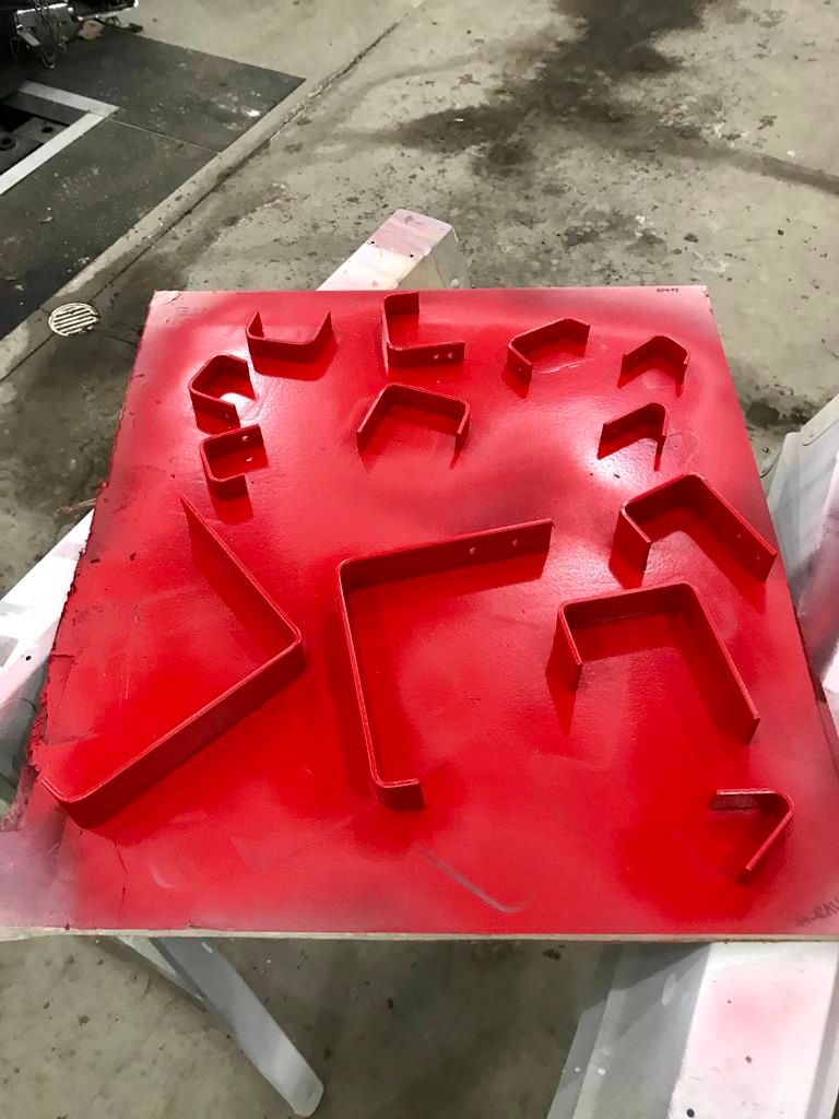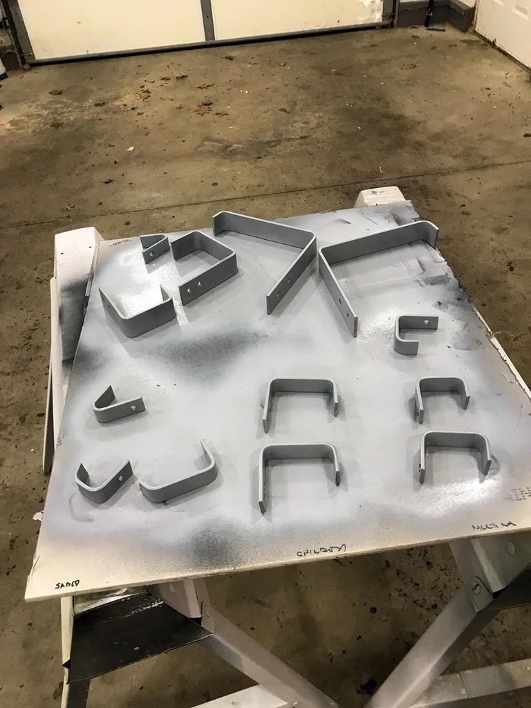 After measuring and some trial and error, bent up sets of brackets for various tools. Used different widths and thicknesses of flat steel depending on the size and weight of the tool. Primed and then painted...