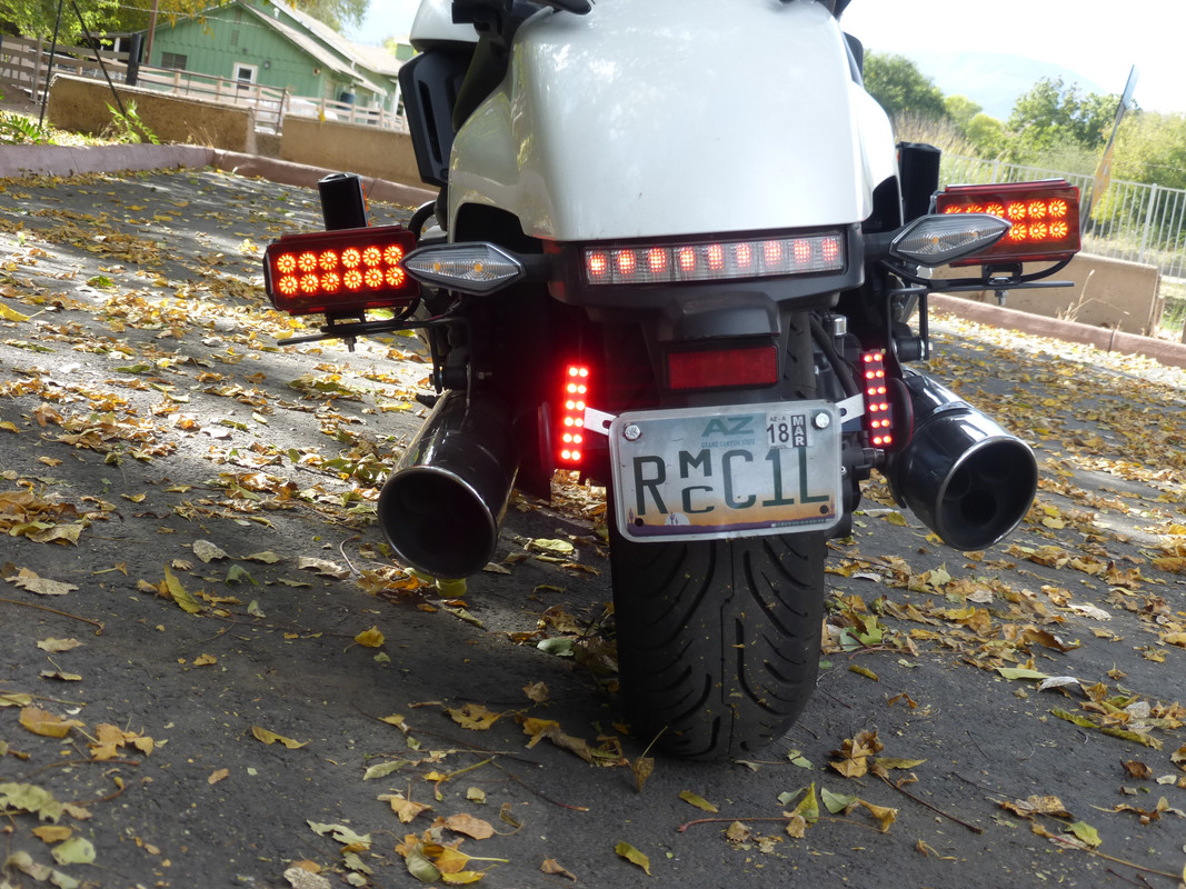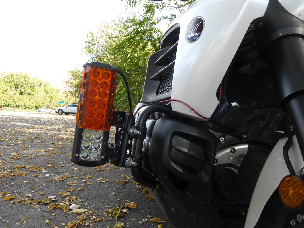 Did you steal those lights off a DOT road-grader?  I couldn't get that in my bike shed door. (2 valks) (well I could, but it would be folded up) They are folded upright , you should see them when they are horizontal . They stick out a long ways . Just kidding about being horizontal , although , I have thought of changing them to a horizontal position . They stay vertical . Those lights get me a lot of attention , that's what I wanted . I did have them fixed to be 1/3 white and 2/3 amber turn , however , I decided 100% amber as a turn was better at being safe , attention getting . Sometimes , people pull of the road for me to pass , at least I think that's what they are doing . I always wave and smile and give them a thumbs up as I pass  I got the lights and amber lenses from Amazon Do you need links ? Here ya go . https://www.amazon.com/Waterproof-Protctive-Covers-Wrangler-Trucks/dp/B06VSGYHHF/ref=sr_1_3?ie=UTF8&qid=1539703102&sr=8-3&keywords=amber+light+bar+lensI added amber film to the inside of the lens making it darker , purchased at auto parts store . To get the2/3 lights blinking and 1/3 as a headlight , I purchased 3 different size lights and moved parts around to get what I wanted , was an easy job