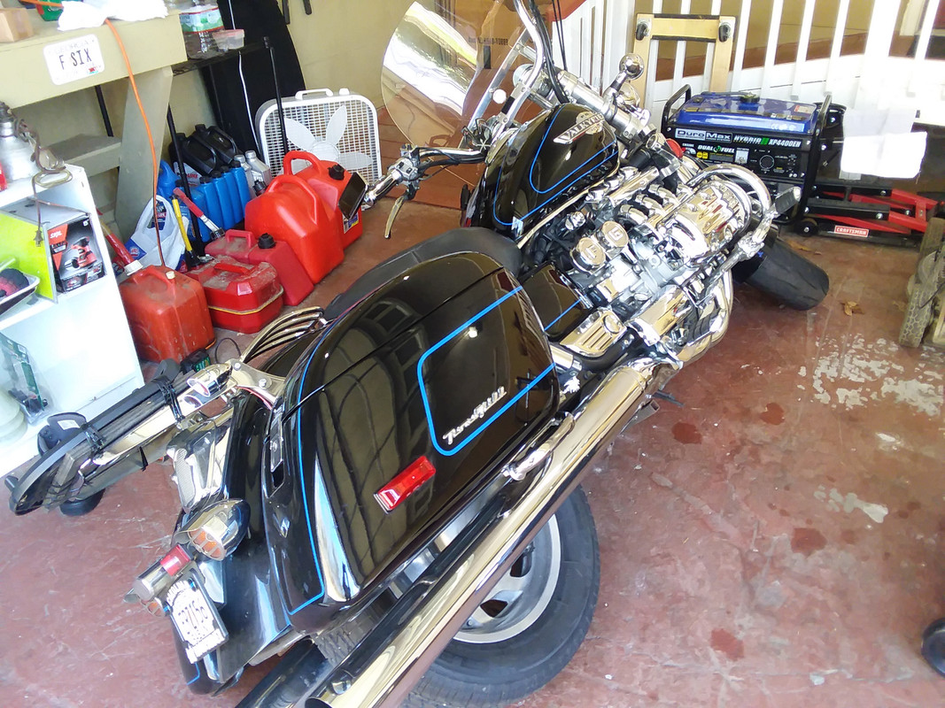 A very nice bike, I love the pinstripping and the chrome is perfect. Its a pain when they get to the tipping point, glad you set her down easily. So you said firemen helped you get it up?  coolsmiley Not that I would know this  Roll Eyes but have heard its only a small spot on the engine protector and the bottom corner of the bags that get anything at all.