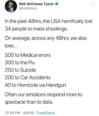 Sudden outbreak of common sense from Neil deGrasse Tyson... I'm sure his friends on the left will tear him apart for daring to speak logic to emotion:  I have no problem with his statement. I would add though, we as a society put much effort and money into solving, curing those issues. We don’t seem to be near as vigilant in mitigating the gun violence issue. It's still my thoughts that in these cases where there was mass unprovoked senseless shootings, that if there was automatic quick judicial death sentences carried out within days of the act that there would be a whole lot less of them. If they knew they were going to be executed within days of there act of violence that they wouldn't be as likely to do it. If they were planning on suicide anyways there is no deterent available.