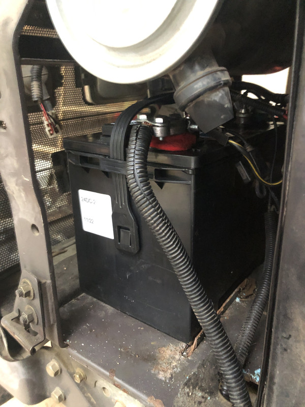 The new battery in place.  You can see the cables that power the "headlights" that had to be disconnected to lower the front grill to get the old battery out