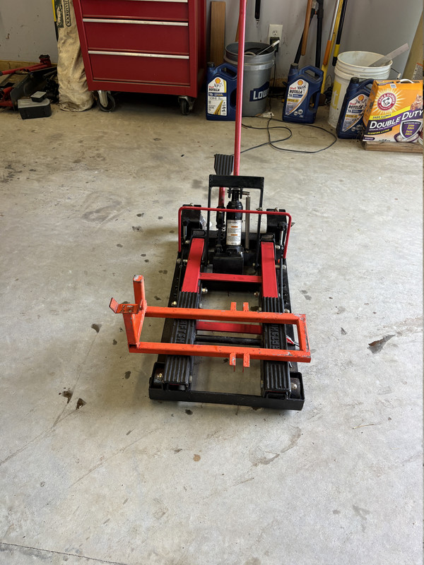 To do this, I will have to jack up the bike. I have a “platform” jack I have used to jack up my Valkyrie before and I have a “stand” that I made (I was into welding some years back and had the tools to weld it).