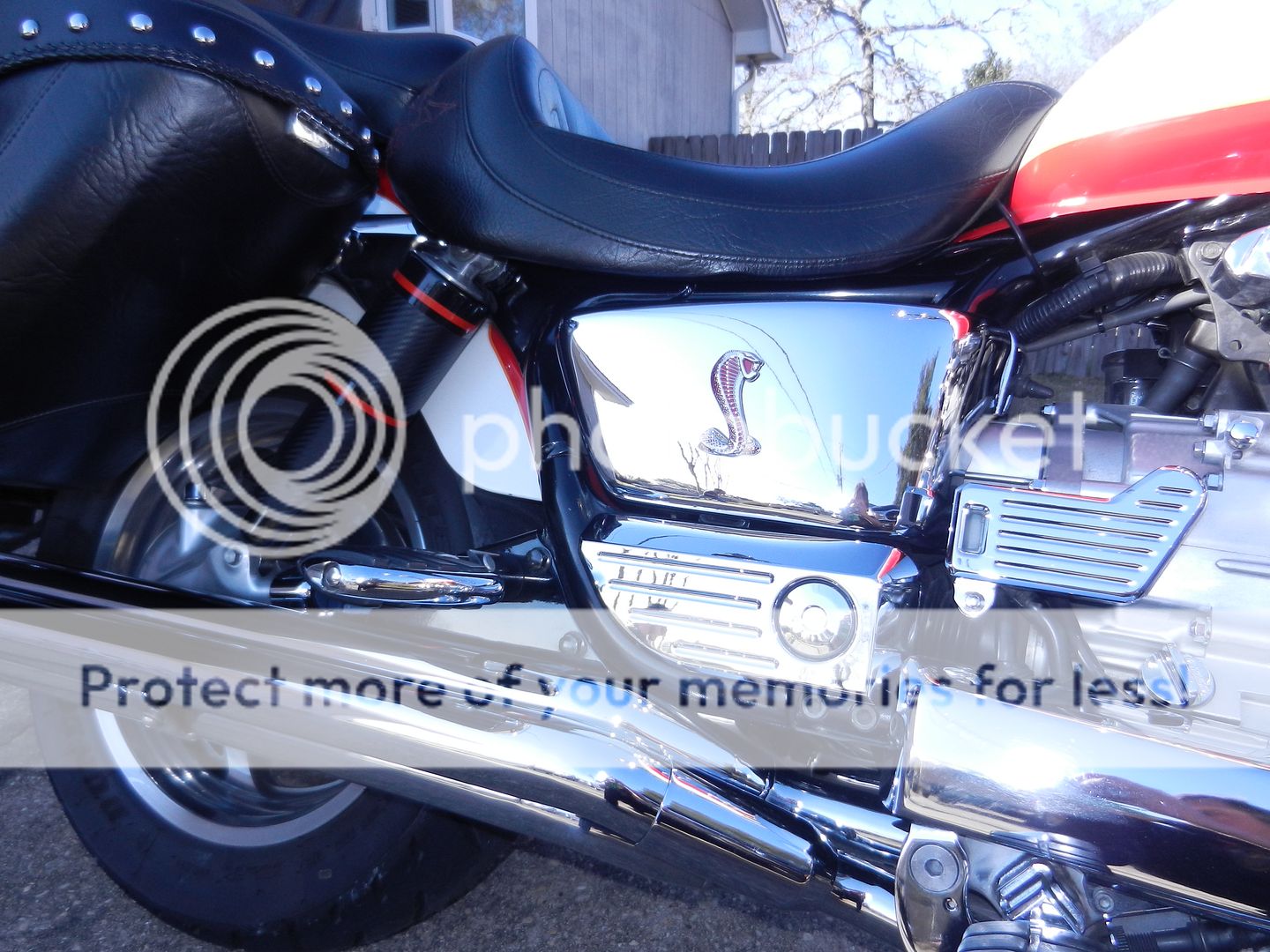 I have maybe 20 or so cobra chrome pieces (wanting a couple more) and so I was looking for a cobra snake for maybe a fender ornament. Well, that was a bust, so I found this chrome and red cobra for a Mustang. It will do, I pretty happy with it. One of my eagle and flag emblem broke a tip off the flag so I put the good one on the back fender.