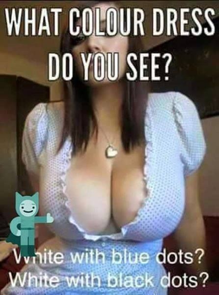 I'm color blind literally, no joke! All I see is 2 puppies!  That dress is just a tad lower than one of the married ladies at work wears at times, but the top size seems about the same D-cups. All the other females in the office talk about what she wears at times (jealous am sure?) but I'm not complaining one bit.