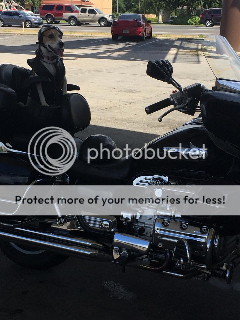 Anyway - to the point - I just purchased an inexpensive top box/trunk for my just purchased interstate.  It is basically a iberglass molded copy of the factory top box minus lights and speakers.  I got the lights and speakers problem covered.  My plan is to mount a couple eyelets in the bottom so that I can secure her harness to the box.  Then by cutting a relief in the lid for her head ... she will have a secure carrier from which she can enjoy the road again.  I figure on freezing water in tuperware so she'll have something to hydrate from and keep the box cooler in the Texas "not winter" season.