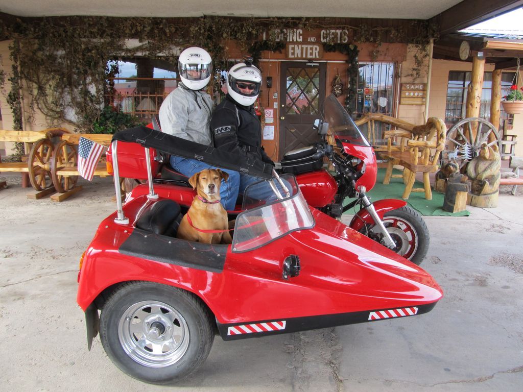 Right now we are dogless. The dogs always rode in the vehicle and it was hard to figure out how to get the big ones in/on a bike. The 'little crap Su' rode in the saddle bag. With the top removed and she had a harness that was tied to a mount bolt.