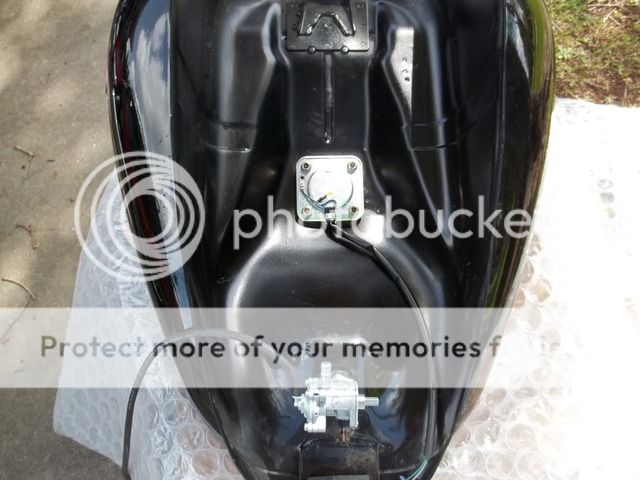 Well, getting Traveller back on the road again after sitting for almost 4 years has been a winter long project for sure. I had to pull the carb stack out twice and changed every o-ring and float needle and new jets. Tried to clean the tank but with my equipment, it was a no go and I found a black tank (just the tin - no sending unit or petcock or lock or anything) on ebay that was WAY clean. I am going to send my red tank to another member for a project bike he is thinking about and he thinks he can get the tank up and running again. So, a bunch of parts arrived while I was in Africa and it was like Christmas again when I got home. I took off the Pingle fuel petcock and went back to an OEM. The Pingle was really hard to reach if you needed to go to reserve, so I opted to back to stock OEM for now.
