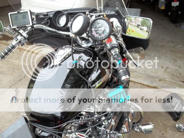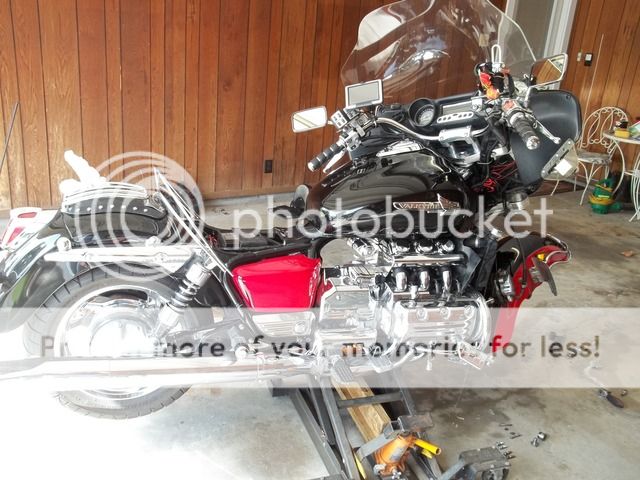 Well, I could not wait any longer...with wire harnesses that I had put in still hanging down, I HAD TO SEE IF SHE WOULD STILL ROLL!!! So, rolled the Vstrom out and ran the air compressor off of her (since I had not wired in my accessory outlet on Traveller yet) and filled the tires......