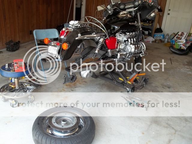 We got the forks back together and the front tire looked ok - no dry rot, so we hit the rear tire. I had been down to the wear bands, so we changed the rear tire (with another Battleaxe) and changed the brake pads on the rear - they were shot.
