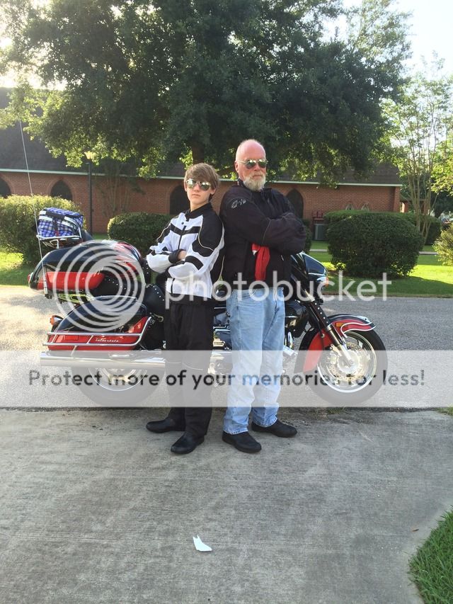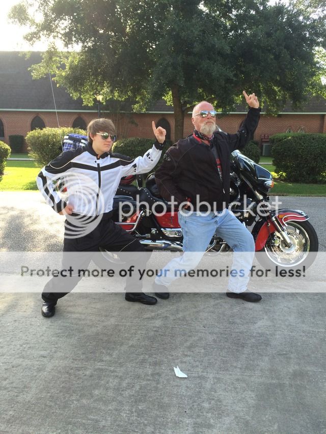 Rode over to his Mom's house to pick him up. He was already suited up and ready to go. We wondered if we should go the "bad azz biker" route - you know, "Don't run over my foot or I will go all Waco on you!"