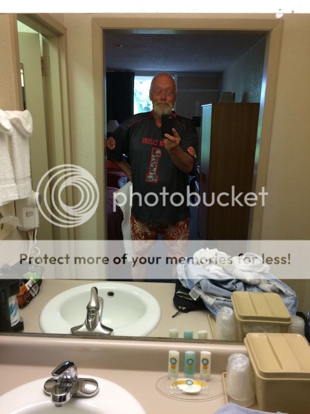 It had been wicked hot, so we brought trunks. I had not been in a pool in 20 years, so since this was a memory ride, had to do it. Yep, these trunks should embarrass him!