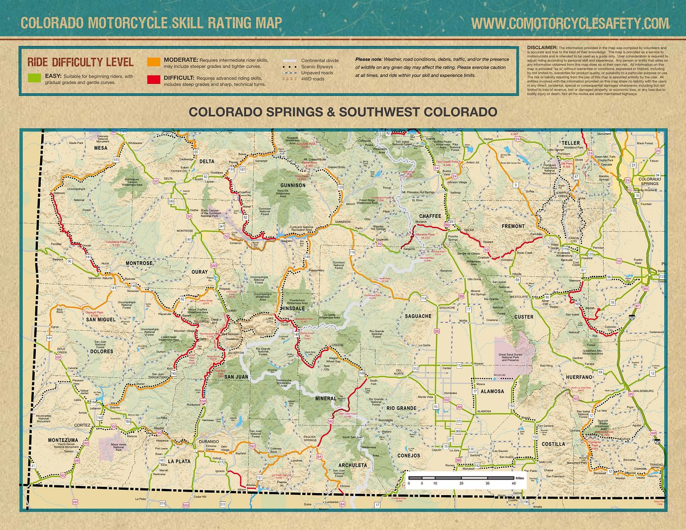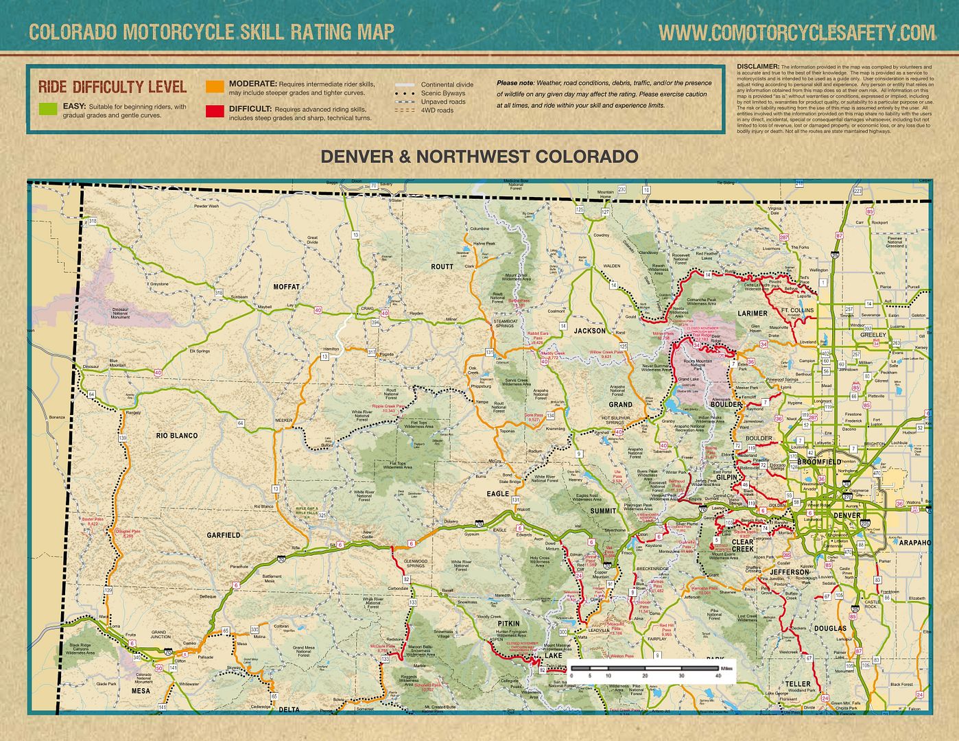I stopped at the Colorado welcome center on 76 about 8:30, had a nice stretch and conversation with the lady there and picked up a really cool Colorado motorcycle map that rated the main roads green yellow or red, easiest to hardest or "motorcycles use extreme caution".
