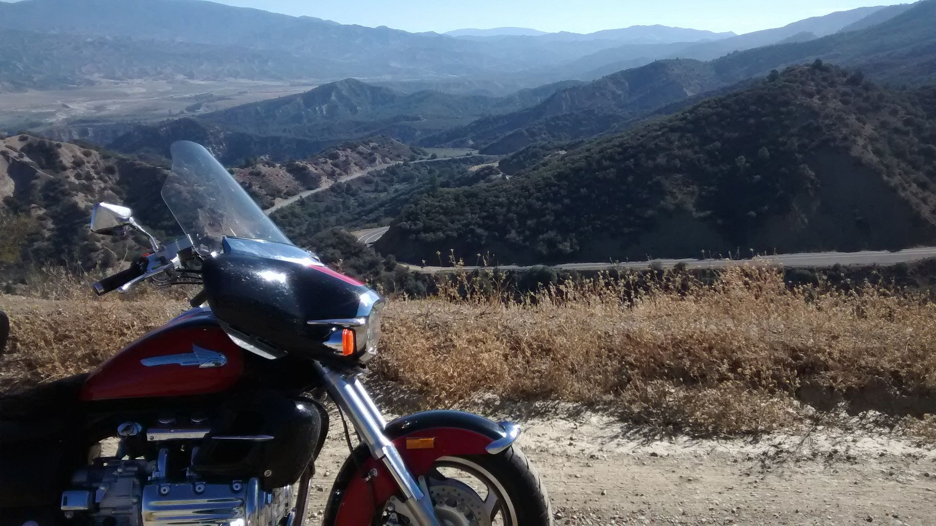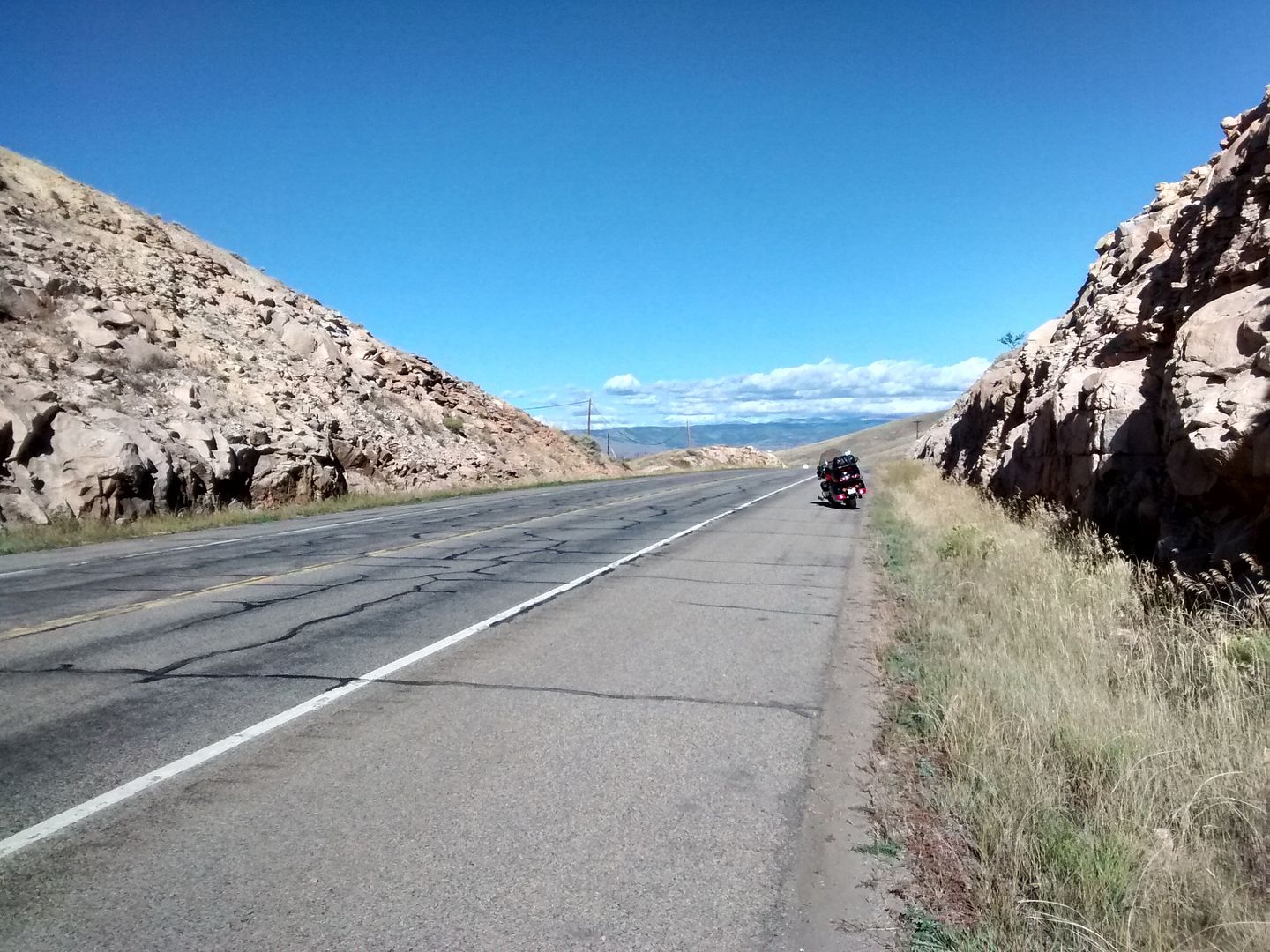 The road maintained a perfectly straight ascent and I was cruising about 75 and could see two bikes in my mirrors, side by side in the left lane approaching rapidly.  The rider on the right had the position of riding the line with his handle bar hanging fourteen inches into the next lane, and I watched this for a few minutes as they approached.  Having lost several IQ points in the heat I said to myself f**k it I ain't moving, and I swear the dude's bar missed mine by 1/2".