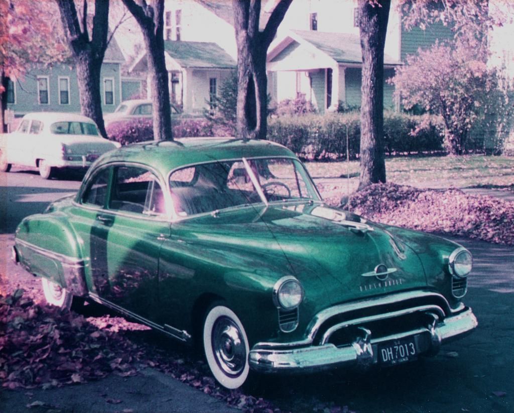 I owned this 1949 Olds Rocket 88 in 1954.  It was originally black but, working in a body shop, we repainted it Kelly green, six coats of hand rubbed lacquer.  The stock 303 ci V8 only developed 135 hp but the torque came on at 1600 rpm.  It was ahead of all other production cars with its four speed Hydramatic which shifted decisively unlike the slushamatic auto trannys of that day.  I I ran this Ectachrome slide through Photoshop to get the true Kelly green color, everything else is off color.cleaned many clocks with it until the 1956 Chevy came out with their 283  (I think) Corvette engine.