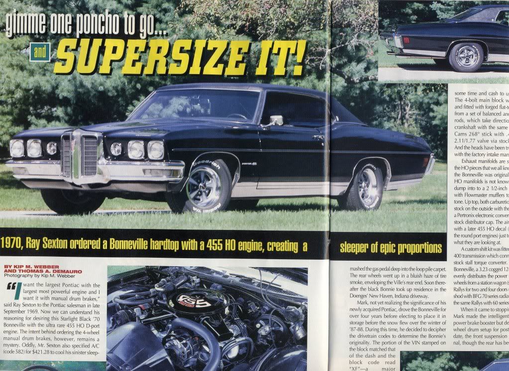 It looks good and is a sleeper since no one expects this engine in a Bonnie. It goes like Sin but doesn't stop, drum brakes.   Here is a pic when it was in Pontiac Performance mag awhile back.