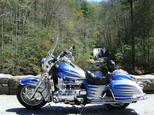 A week before " The Fall Color Ride 2015 " we was at a friends place in the mountains of North Carolina when my bike was hit in the parking lot . I first took the damaged saddlebag to Foster for repair and paint<---Most here know what happened to him on the FCR  Embarrassed   Foster was in the hospital 101 days and it was several weeks before I got his brother to get my saddlebag from his shop. A paint and body shop that has done work for me in the past did the work and I had to have both saddlebags painted so they would match.They did a great job matching the paint and made the scallops larger as well. Yesterday I got them mounted and today took my first ride on this bike since mid Oct 2015. My riding bud Paul ( Wimp ) and I hooked up this morning and made a ride over to visit Foster who is still recovering and moving slow however he is getting better with each passing day. After leaving Foster's place we took a nice ride along The Tennessee River. First two pictures taken today with the new paint on the bags ... Last picture was taken on Little River Road in The Great Smoky Mountains a couple years ago and show's the " BEFORE " picture.
