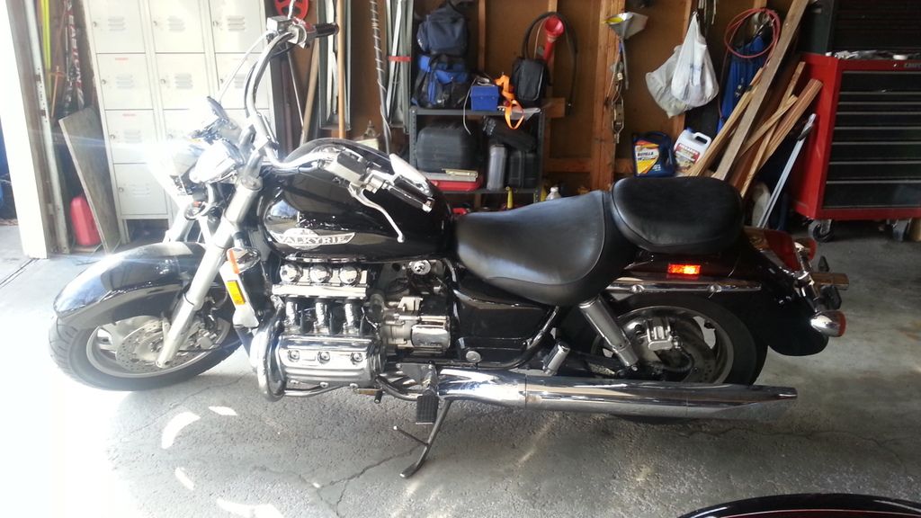 A relative of my wife contacted me last week and asked if I wanted his 98 Valk Standard. Not being flush with cash I asked what he wanted for it. He said, "well it's been sitting a few years (Three) and I don't really want to spend the money to get it running. I'd sell it to you for $1000." When my heart started beating normal again I of course told him, "you know you could get a lot more for it with out doing anything to it." He said, "I'd know I could but I know you like them so are you interested?" Pick it up this morning, had to rent a trailer as my 8' won't quite fit it.  26,600 on the odometer, I've got the sissy bar for it. New Metzler tires 3 years ago and a new Yusa battery, 3 years old. He put stabil in the tank before he parked it. Got it home and check the tank, no rust, the tank is still 3/4 full but the fuel looks pretty bad. Throttle cables stuck, choke cables stuck. When I check the battery it still had 10 volts on it so hopefully I can save it. Wife wasn't please I've got another project but I'm remodeling the bath for her and it's something I can ride solo instead of hauling out the I/S. Plan on pulling the tank draining the gas and see what's sticking the throttle and choke cable's. Was planning on pulling the carbs too but now I may just see how it runs depending on what I find. I'll do fluid changes and i'll need to check the rear brake. He rebuilt the back caliper and said the rear brake seems to lose pedal after a could times braking.