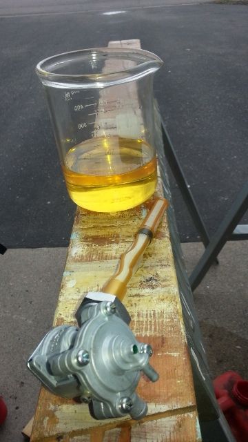 Pulled the tank while the wife was painting the bathroom. Was really surprised tank is like new. As you can see below the petcock and the first gas drained from the tank, looks perfect. I guess Stabil really works well, (3 years sitting)  As long as the CP (Chief Purchaser) wasn't missing me I went ahead and pulled the air box, then kept going and pulled the carb bank. Of course I had to pop the float cover on one carb just to see and it was pretty clean BUT! Found the float valve stuck so I pulled the cover on one of the needle jets and the vacuum slide was stuck. It didn't take much to pry it up and the needle really looked good. It looks like I made the right decision to pull the carbs, it's my guess that every float valve and needle jet will be stuck. It's been quite a while since I smelled the stink of the that old gas in the carbs. I ordered a de=smog kit from redeye, figured I might as well do it while the carbs are out, also ordered some float bowl gaskets and I already have some intake O-rings. I also happened to have 6 float valves so I'll replace them also I do have one question, I noticed when I pulled the airbox that the boots are lose. Does there need to be a good seal there, I seem to remember seeing a post of someone using gorilla glue to seal them off.