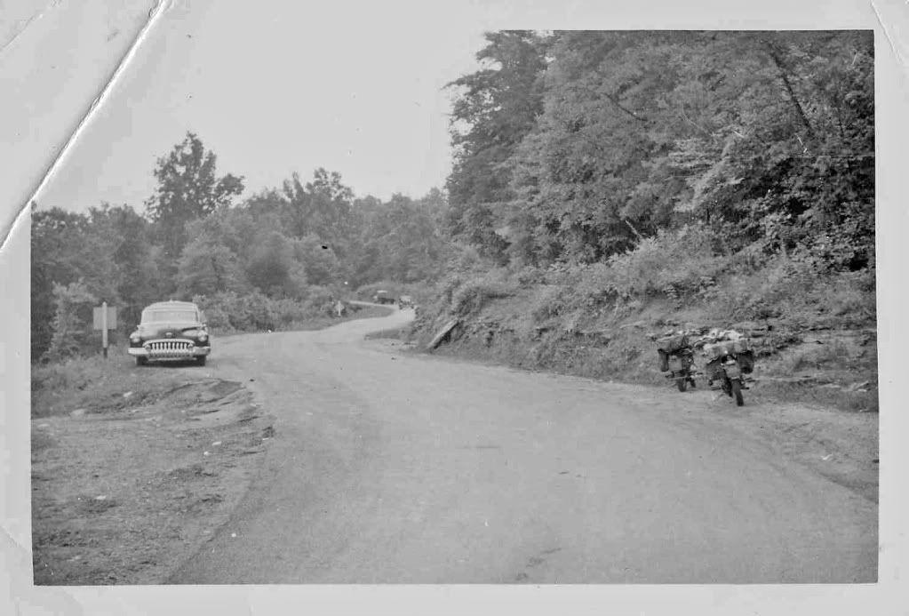 On to the uncompleted Blue Ridge Parkway. Then, as now, it was a beautiful ride except that we would just start enjoying it and would have to get off because a segment was unfinished. Off and On, Off and On. I remember going through Canton NC and Spruce Pines, among other towns in a zig zag fashion. I also remember coming around this blind curve and having a line of gravel piled four feet high in the middle of the road for about a mile. Unfortunately, I ended up on the left side of the road with Vic on the right. Luckily not much traffic so I joined him again when the gravel disappeared..