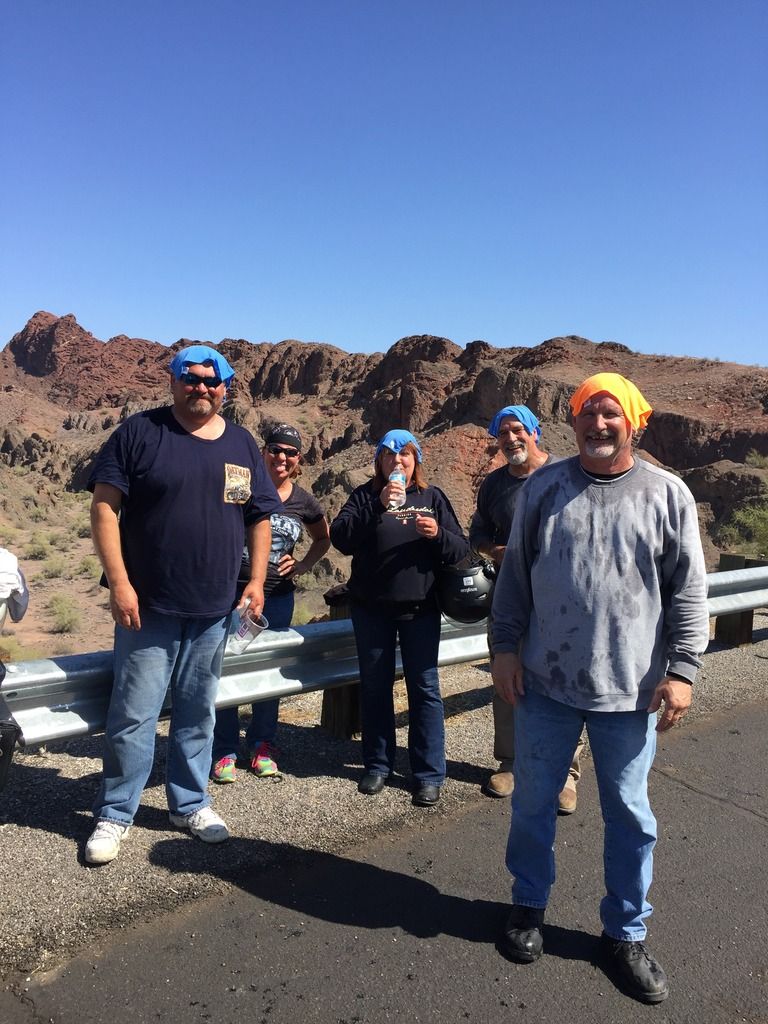 Luckily we still had plenty of ice and water as we waited for the tow truck. I improvised some Arab DoRags out of some microfiber cloths I had. Grin