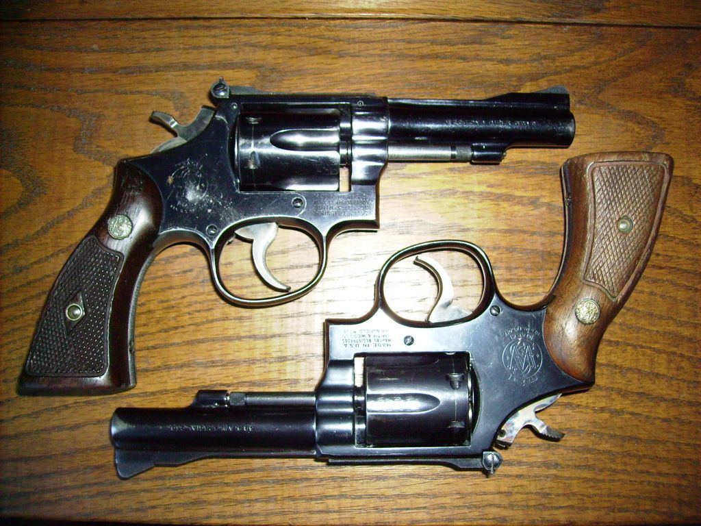 The lower one is Sweet Tooth's S&W Model 15 ".38 Combat Masterpiece" that I liberated from the bedside safe long enough to snap the picture. The new one is a Model 18, a twin to her .38, except for being in .22, and I'm hoping she'll do a lot more practicing once I hand this one over to her. Lots of holster wear and there's a scratch on the other side of the frame to balance out the bit of pitting on the S&W monogram on this side, but her Model 15 is an old police trade-in so they aren't all that much out of matching finish-wise...