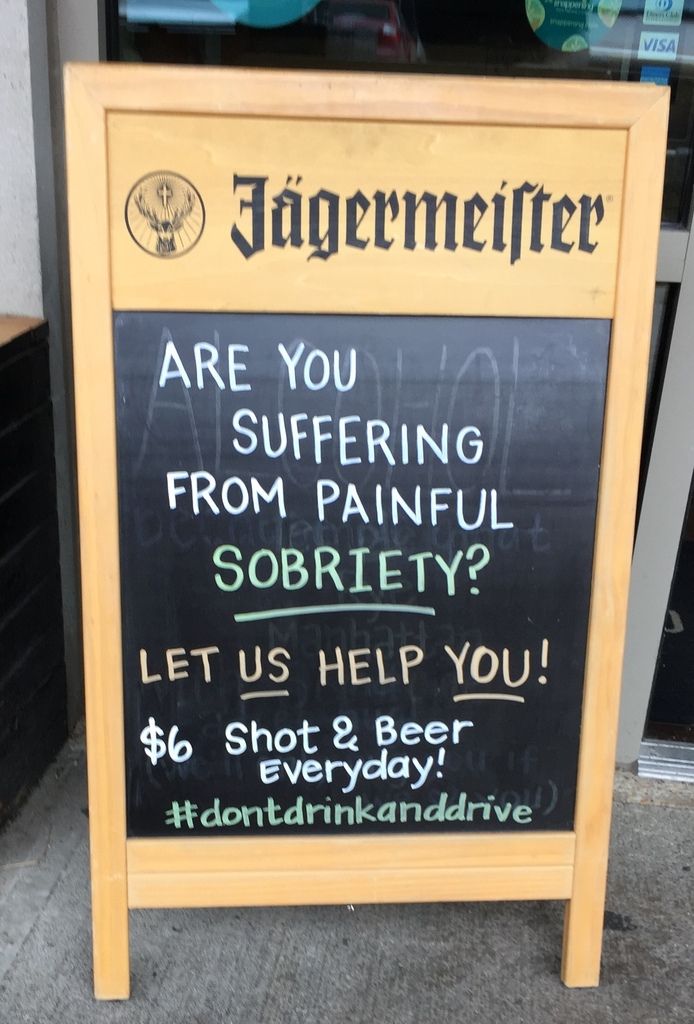 More of a picture than a sign BUT I liked it-jane fondas picture in a urinal. Also seen above a urinal-we aim to please-you aim too PLEASE. Seen in more than one Navy head-flush twice-it's a long way to the chow hall. At a video store I frequented in Colorado-if you smoke we will assume you are on fire and take the appropriate measurers. Also-smoke if you must just don't exhale. RIDE SAFE.