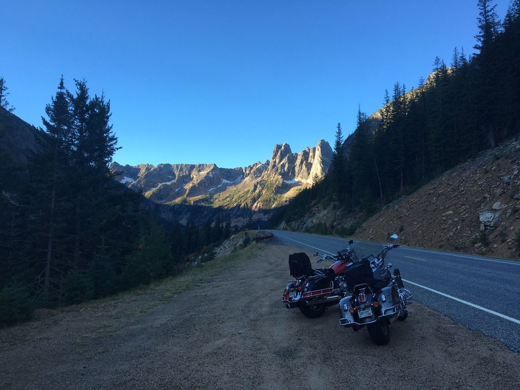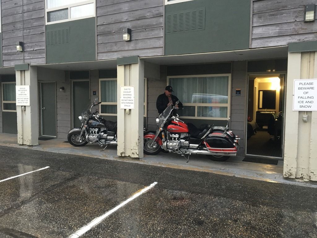 Made it to Kamloops, we're all dry, waterproofed, headed south  southeast 5 to 5a to 3 to 97 back to the states. Taking route 20 west to Winthrop Wa, staying here for the night, motel manager lets us use the water hose to clean the road grim off the bikes. Ate diner at Three Finger Jacks, Damon and I both had the fish and chips, best I've had. Get there early they tend to run out of pie. There is a little store directly across the street that makes a great ice cream cone.