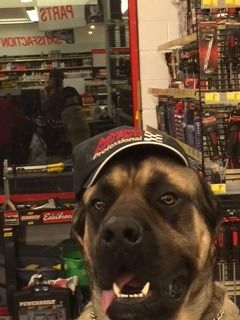 You're a good man Alpha. Honestly, I consider myself lucky that I got Bowser not that he got me. He's a pleasure to have around.  Here's one of Bowser I took on what I knew would be a slow night at my part time job. His front paws are up on the counter on the cashier's side. A co-worker put his cap on Bowser's head and this is the result. He's a big ham..............