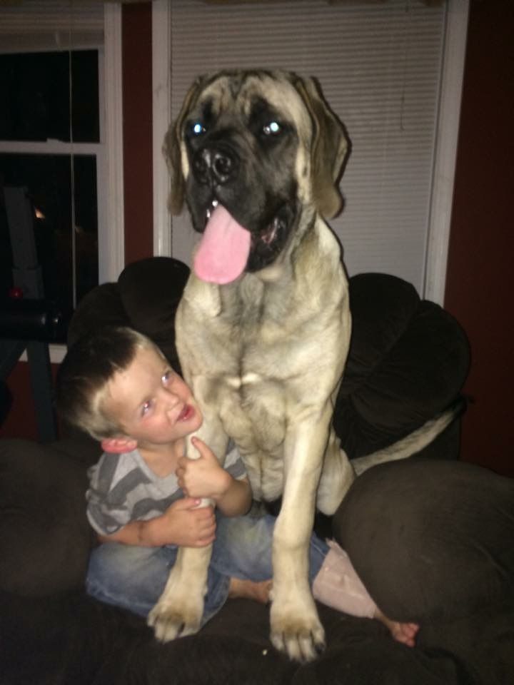 Here's one of my buddy Bowser and his previous owner's child.  They paid $1800 for Bowser as an 11 week old puppy. Then decided about the time he was a year old he was too big for their kids.  I adopted him on the spot upon meeting him. He travels with me frequently. Had to take the back seat out of my truck to accommodate him but, it was worth it. Now, if I could only get him to drive once in a while.  At his last visit to the vet, he weighed 174 but should get a little more filled out as he matures.  This is Bowser and my son Matt last fall dancing in my back yard.